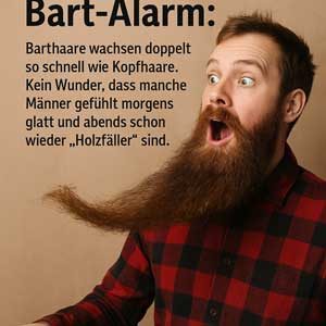 Bart-Alarm: Barthaare wachsen doppelt so schnell wie Kopfhaare. Kein Wunder, dass manche Männer gefühlt morgens glatt und abends schon wieder „Holzfäller“ sind.