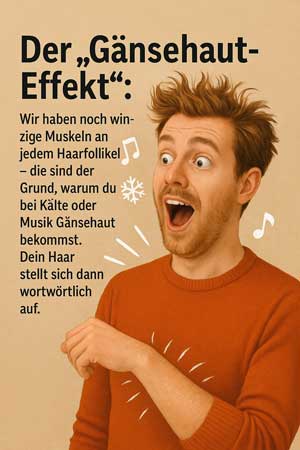 Der „Gänsehaut-Effekt“: Wir haben noch winzige Muskeln an jedem Haarfollikel – die sind der Grund, warum du bei Kälte oder Musik Gänsehaut bekommst. Dein Haar stellt sich dann wortwörtlich auf. 🎶❄️