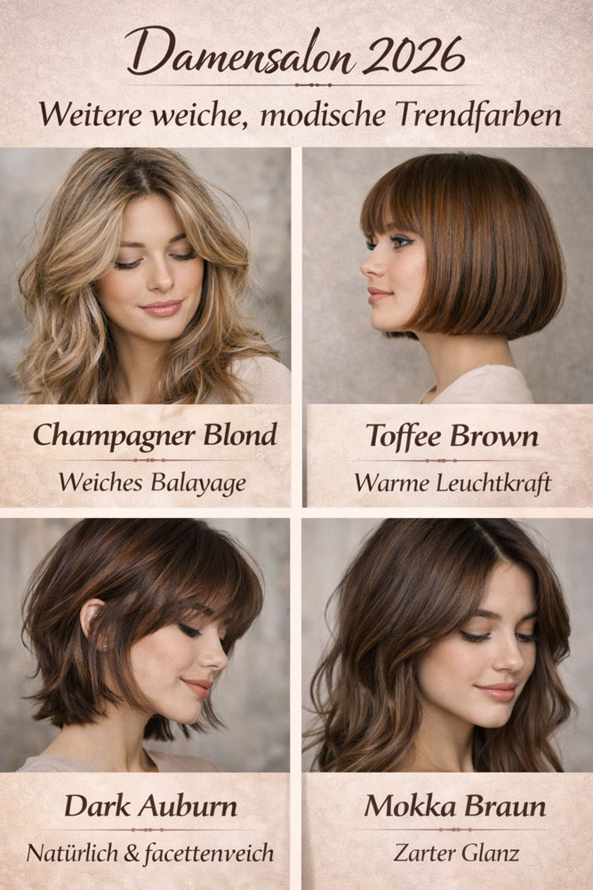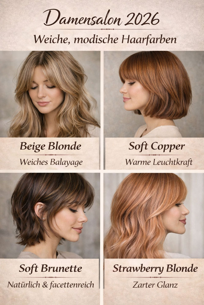 Die Farbtrends 2026 setzen auf natürliche Eleganz und sanfte Töne. Von warmem Beige Blond über schimmerndes Soft Copper bis hin zu tiefem Mocha Brown – die Palette vereint Luxus mit Natürlichkeit. Ice Blonde sorgt für kühle Raffinesse, während Rose Blush einen zarten, femininen Akzent setzt.Die Farbtrends 2026 setzen auf natürliche Eleganz und sanfte Töne. Von warmem Beige Blond über schimmerndes Soft Copper bis hin zu tiefem Mocha Brown – die Palette vereint Luxus mit Natürlichkeit. Ice Blonde sorgt für kühle Raffinesse, während Rose Blush einen zarten, femininen Akzent setzt.