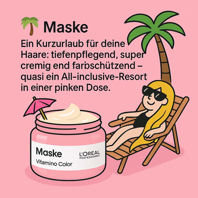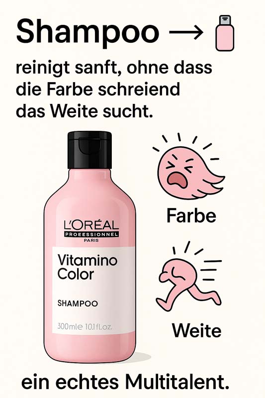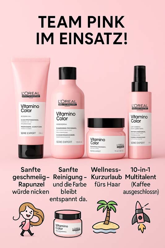 Zum Glück gibt’s die Rettung: L’Oréal Professionnel Vitamino Color – die pinke Superhelden-Crew für alle, die ihre Haarfarbe lieben und sie genauso lange behalten wollen wie ihren Lieblingslippenstift. 💄